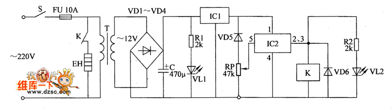 The temperature controller circuit is composed of the power supply circuit and temperature detection control circuit, and it is shown as the chart. Power supply circuit is composed of the power switch S, fuse FU, power transformer T, rectifier diodes VD1 ~ VD4, three-terminal voltage regulator integrated circuit IC1, resistors RI and limiting resistor RI, power indicator LED VL1. Temperature detection control circuit is composed of the temperature sensing diode VD5, potentiometer RP, electronic switch integrated circuit IC2, relay K, diode VD6, resistor R2 and LED VL2.