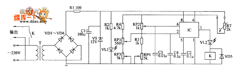 The temperature controller circuit is composed of the power supply circuit and temperature detection control circuit, and it is shown as the chart. Power supply circuit is composed of the power transformer T, rectifier diodes VD1 ~ VD4, resistors RI, power indicator LED VL1, filter capacitor C1 and Zener VS and so on. Temperature detection control circuit consists of thermistor RT, time-base integrated circuit IC, potentiometers RP1 ~ RP4, resistors R2 ~ R4, capacitors C2 ~ CZ, relay Kl, diode VD5 and light emitting diode VL2.