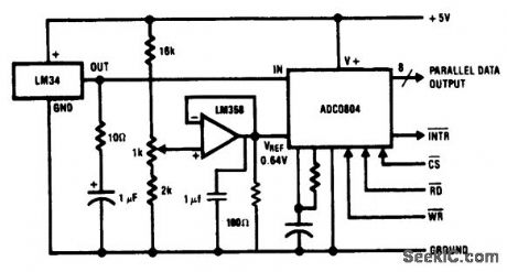 Fig. 13-7 This circuit converts temperature (from 0 to 128°F) to a parallel data word (8 bits when appropriate read, write, chip-select signals are received from the system). The circuit can be interfaced with a standard microprocessor data bus, and it provides an interrupt signal to the microprocessor. The scales are adjusted by the 1-kΩ pot so that all 8 bits are at digital1 when the temperature is +128°F. In practice, the VREF/2 pin of the ADC0804 is set to 0.64V. National Semiconductor Linear Applications Handbook. 1991 p 1077.