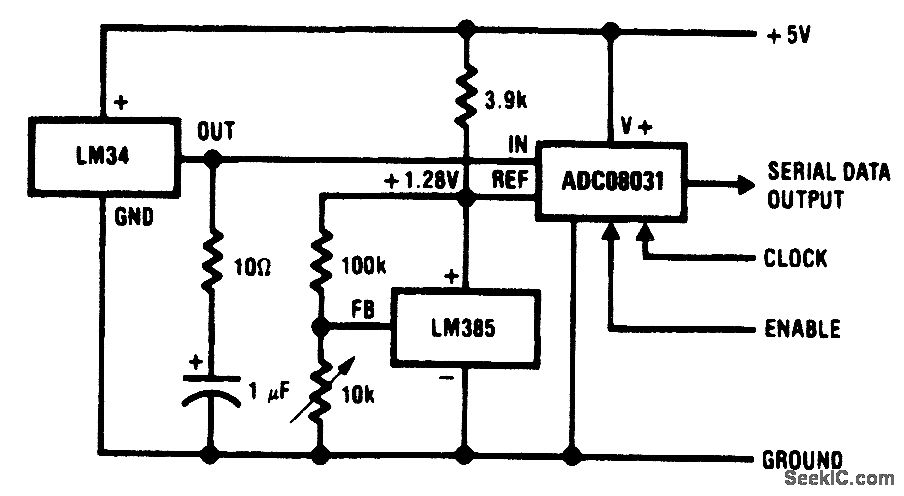 Fig. 13-6 This circuit converts temperature (from 0 to 128°F) to a serial data word (8 bits when appropriate clock and enable signals are received from the system). The scales are adjusted by the 10-kΩ pot so that all 8 bits are at digital 1 when the temperature is + 128°F, In practice, the VREF pin of the LM385 is set to 1.28 V. National Semiconductor, Linear Applications Handbook 1991 p 1076.