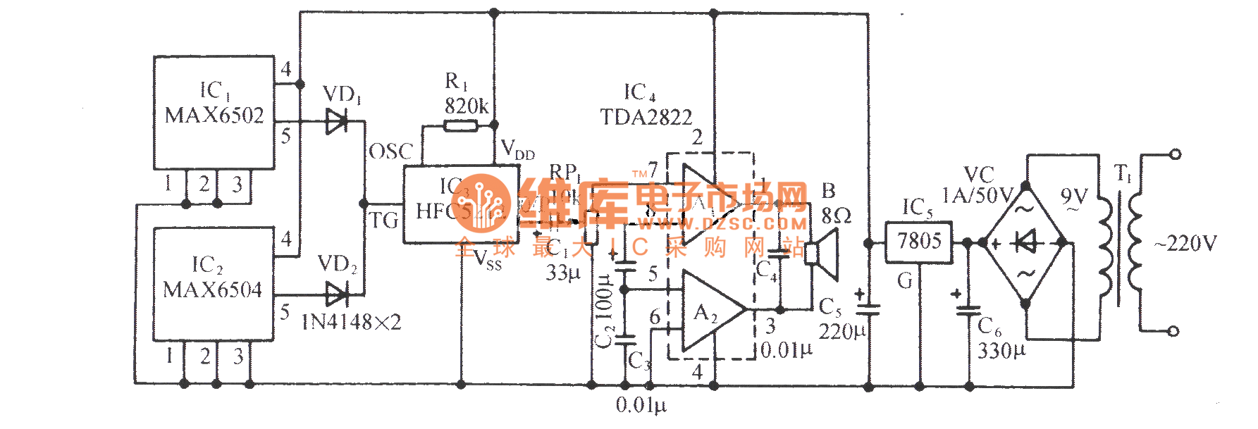 The circuit is as shown in the figure, it is composed of the upper limit and lower limit temperature detection circuit, the voice circuit, the audio amplifier circuit and the AC step-down rectifier circuit. The temperature upper limit monitor uses the temperature switching integrated circuit MAX6502 to monitor, it can changes the temperature of the monitored objects into the corresponding electric signals, when the signal voltage exceeds the threshold temperature, the voltage comparator of the switch compares and adjudges the signal, and the monostable trigger outputs the plastic pulse, the push-pull output level outputs the high level control signal.