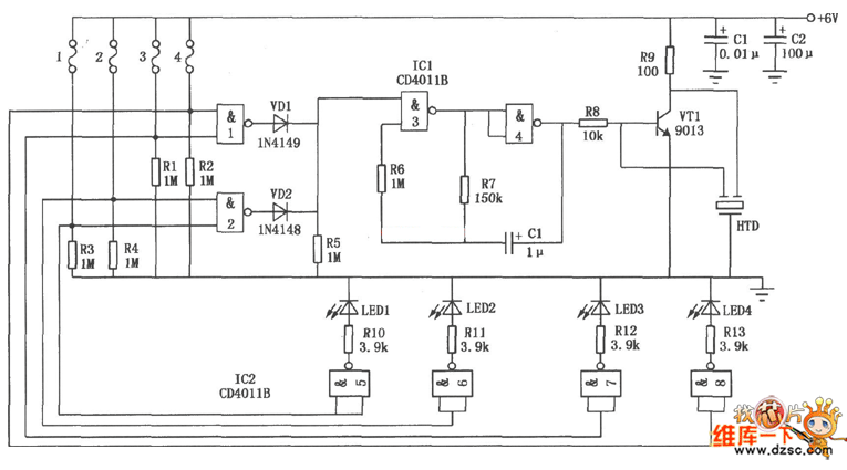 The 4-line burglar-proof alarm circuit is shown in the figure, which consists of the CD40118 integrated chips, it belongs to the multi-line burglar-proof alarm, and it can be used in 4-line burglar-proof alarm spots. It can not only make alarm sounds, but also indicate the monitored 4-line burglary in the term of LED.