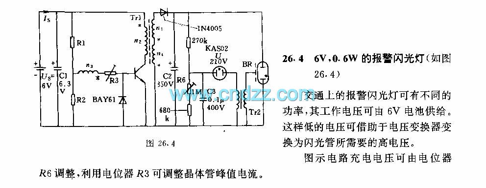 The 6v,0.6w alarm flashing lamp circuit(see as figure 26.4) The alarm lamps in traffic have different powers, whose working voltage can be provided by the 6V battery, such a lower voltage can be switched into the high voltage that the flash lamps need. The figured charge voltage can be regulated by the potentiometer R6, and the transistor peak value current can be regulated by potentiometer R3.