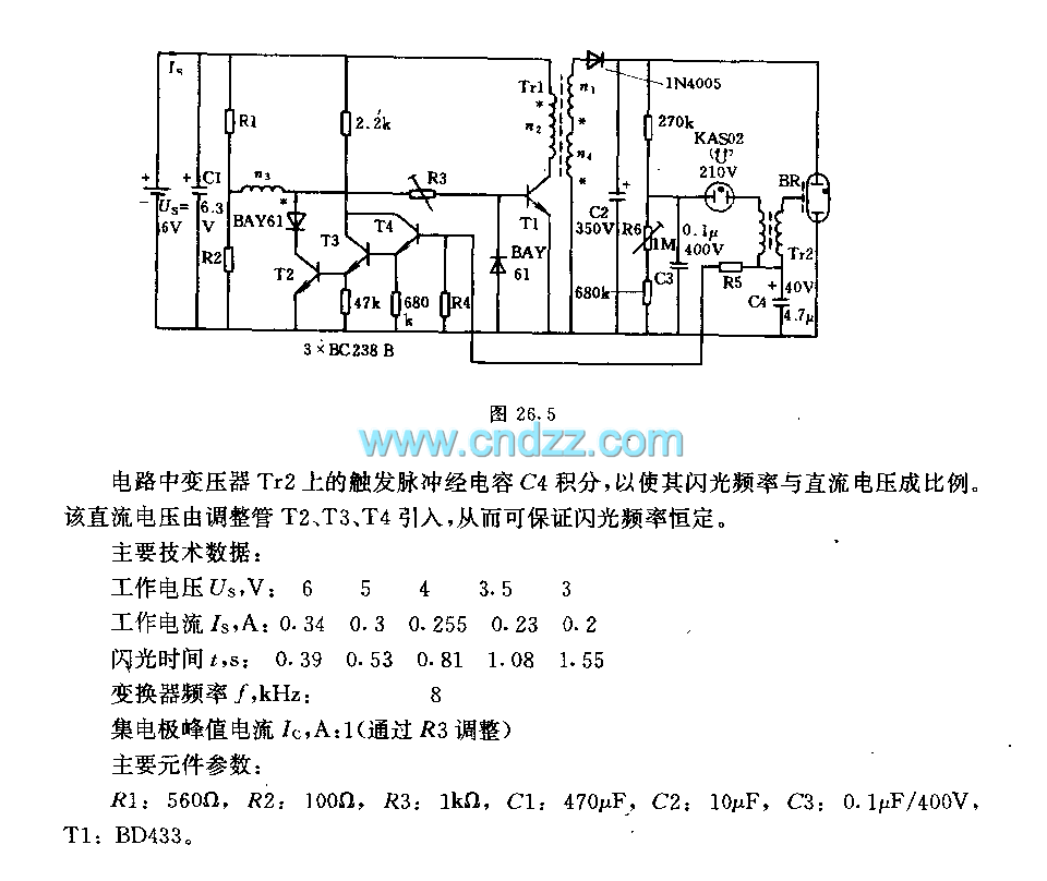 In the circuit, the trigger pulses on the transformer Tr2 are integrated by the capacitor C, so the flash frequency is in proportion to the DC voltage. The DC voltage is imported by the regulators of T2, T3 and T4, so the flash frequency is sure to be constant.Main technology data:Working voltage Us, V: 6 5 4 3.5 3Working current Is, A: 0.34 0.3 0.255 0.23 0.2 Flashing time t, s: 0.39 0.53 0.81 1.08 1.55The converter frequency f, KHz: 8The collecting electrode peak current Ic, A: 1 (regulated by R3) Main element parameters:R1: 560Ω, R2:100Ω R3: 1KΩ C1:470μF, C2: 10μF, C3:0.1μF/400V, T1: BD433.