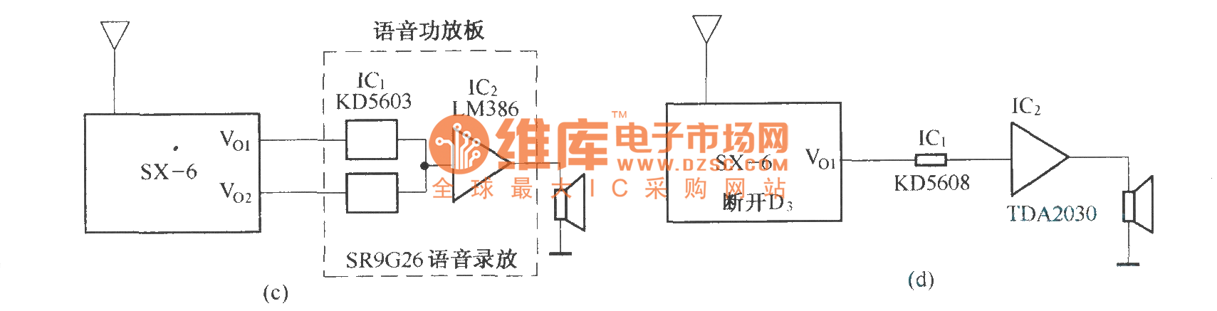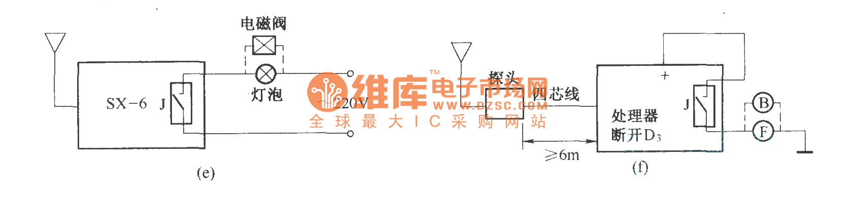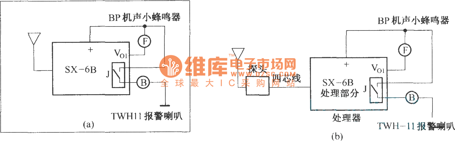 In figure (a) is the radar alarm composed of the SX-6 human body inducting switch; In figure (b) is the radar alarm whose probe and host are divided; In figure (c) is the auto audio device composed of the SX-6 human body inducting switch; In figure (d) is the electric dog circuit composed of the SX-6 human body inducting switch; In figure (e) is the energy-saving auto switch circuit composed of the SX-6 human body inducting switch; In figure (f) is the fast reaction alarm composed of the SX-6 human body inducting switch.