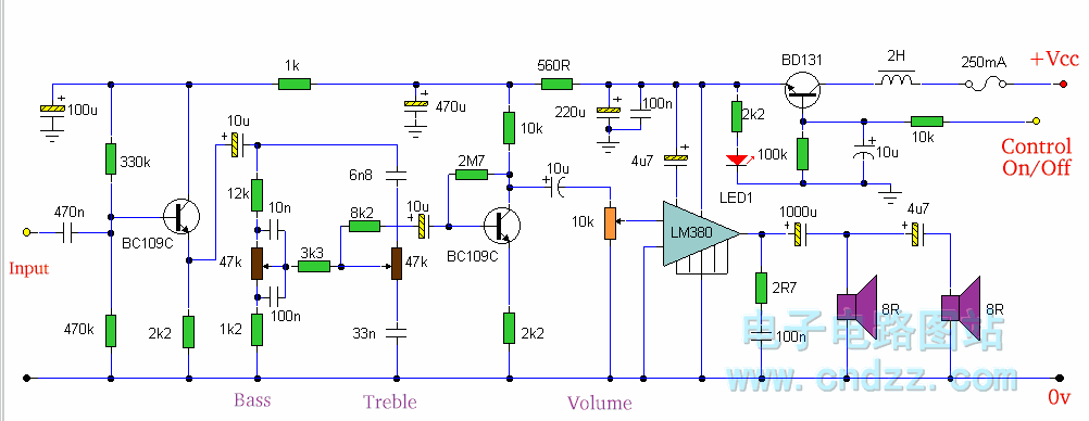 The soft switching is enabled by a BD131 transistor wired as a switch in emitter follower configuration. The collector is wired to a permanent supply voltage, the 2H series inductor serves only to filter out power supply hum. This inductor is not too important and may be omitted if the DC supply is adequately smoothed. The control voltage is applied to the BD131 base terminal, the 10u capacitor and 10k resistor having a dual purpose:-i) a gradual charge of the 10u capacitor ensures that the transistor will switch linearly from 0 volts to full supply, andii) serves as a hum filter ensuring a very smooth dc supply to the amplifier and tone controls.LED1 will light when the amplifier is on. The control voltage should ideally be 0 volts when the amplifier is off and full supply voltage when on. The LM380 is shown driving two 8 ohm loupspeakers, the load is therefore 4 ohms. The 4u7 capacitor acts as a crude crossover, lower frequencies are impeded and so this loudspeaker may be a tweeter type.