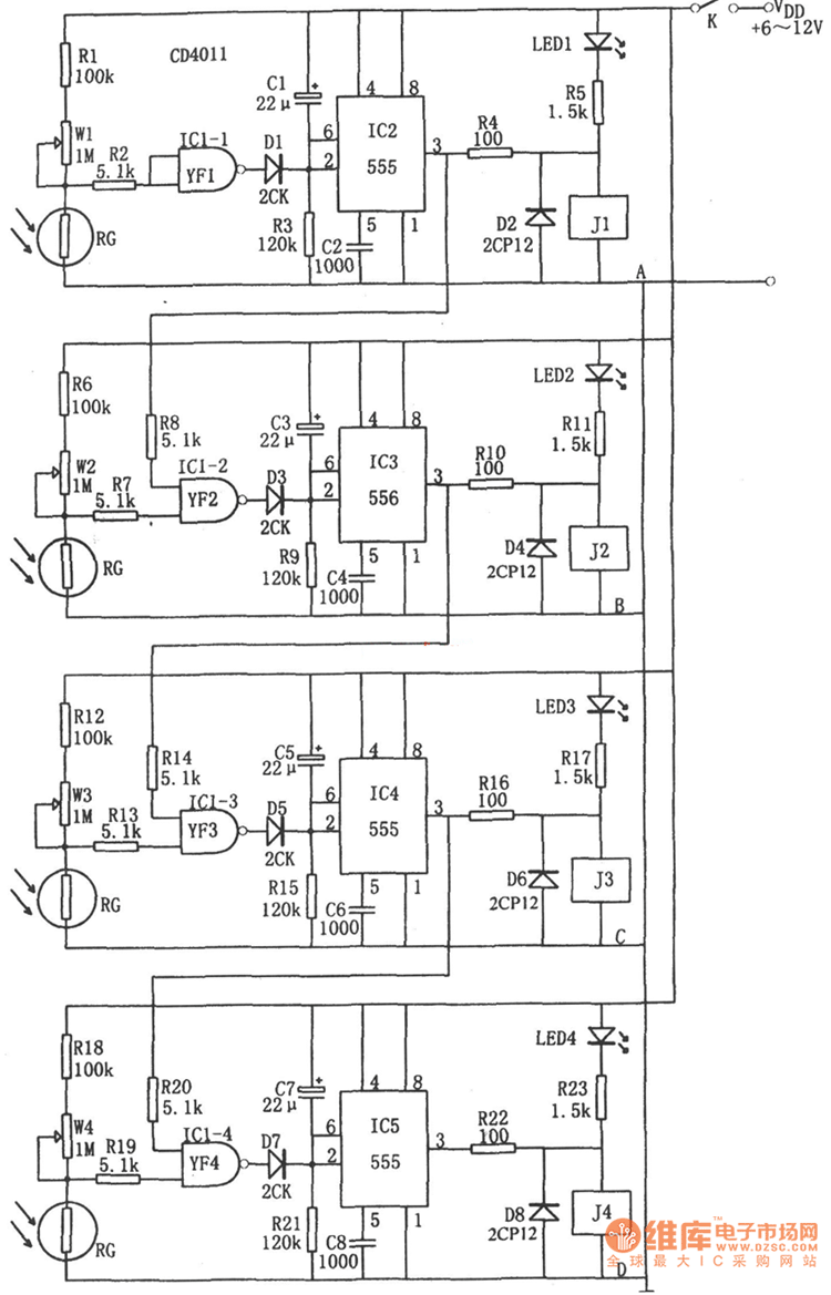 The following is an auto-illuminance control system circuit. This control system consists of 4 streams of photoelectric switch circuits. Take the first stream as an example, the light dependent resistor(LDR) is in a low resistance in the light, but it is a high resistance when the light is weak or it's dark outside. Therefore, when it's dark outside, the high voltage, which is got by the high-resistant RG, R1 and WI, flows through the NAND IC1-1(1/4 CD4011), and then it is imposed on 5-pin of IC2(555), which makes the 2-pin of IC2 to be offset due to the low LEV and the 2-pin is in a steady state, the 3-pin outputs a high LEV, the relay of J1 pulls in and relevant devices are glowing.