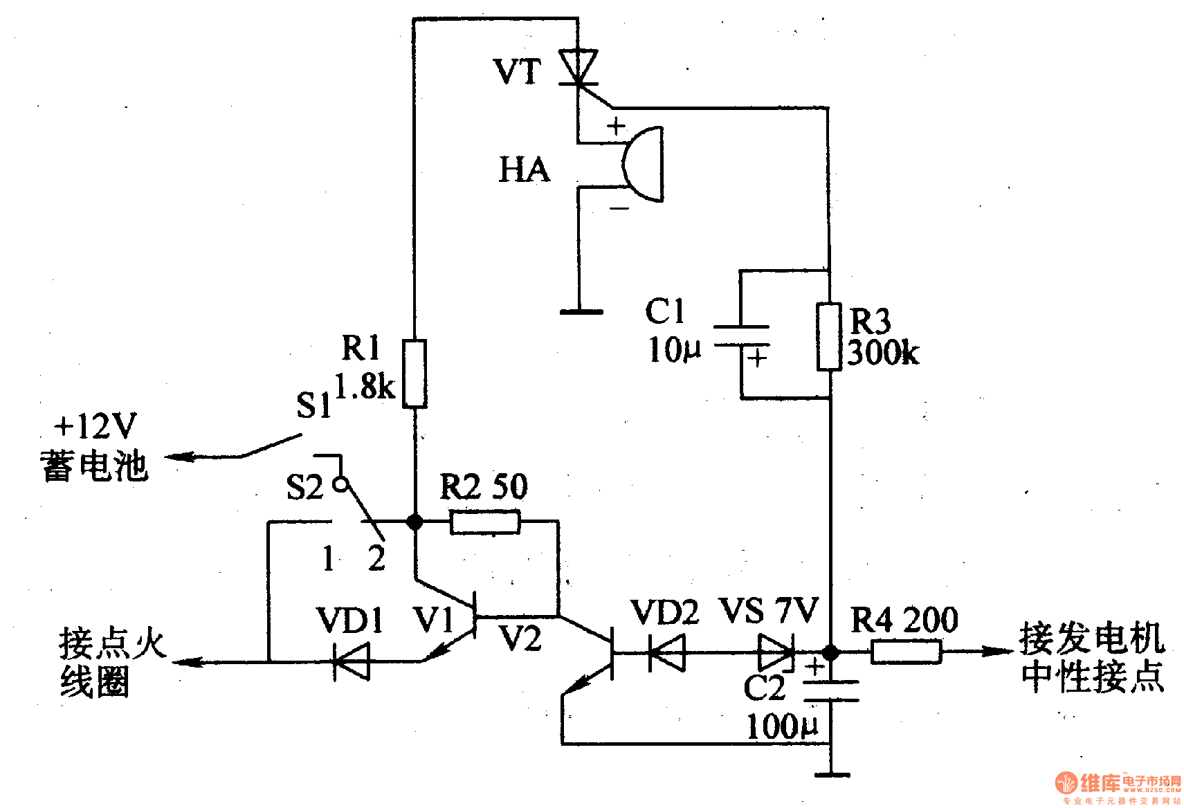 The burglarproof control circuit consists of the car igniting switch S1, burglar switch S2, diodes of VD1 and VD2, transistor V1 and V2, resistor R2 and capacitor C2. The trigger alarm circuit consists of the resistors (R1, R3 and R4), capacitor C1, thyristor VT and buzzer HA.