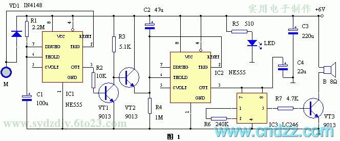 The circuit is shown in figure 1, which is composed of the 555 time-based integrated circuit and alarm integrated circuit. The time-based circuit IC1 consists of the temporary single steady trigger of T=4min or so with R1 and C1. Usually, IC1 is in the stable state, and the 3-pin of it outputs a low LEV, VT1 is blocked, VT2 is conducting, the capacitor C2 is shortened by VT2 and can't be charged, the 6-pin on the threshold of the time-based circuit IC2 is in a high LEV, while 3-pin is outputting a low LEV, the alarm sound integrated circuit IC3 is not working without power, the loudspeaker is silent. M is the touching electrode chip which is linked to the lock.