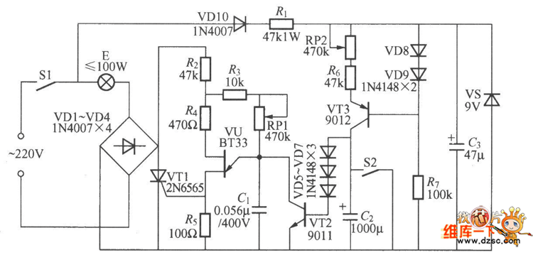 The figured lamp circuit can not only casually regulate the light, but also has the function of timing and putting out the light, which consists of the thyristor light regulating circuit and thyristor time delay circuit, two parts in total.