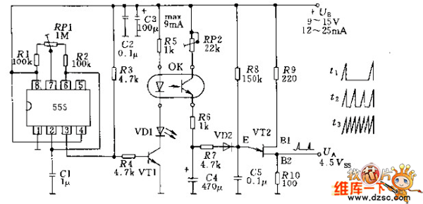 In the figure is the electric whistle alarm circuit that can generate the rising and falling tone sound. The sound is generated by two generators (timer 555 and single knot transistor 2N2648) that are coupled by the photoelectric coupler; The 555 generator produces the 0.3HZ frequency signal, which makes the single knot transistor VT2 sound generator strengthen or weaken in this rhythm.