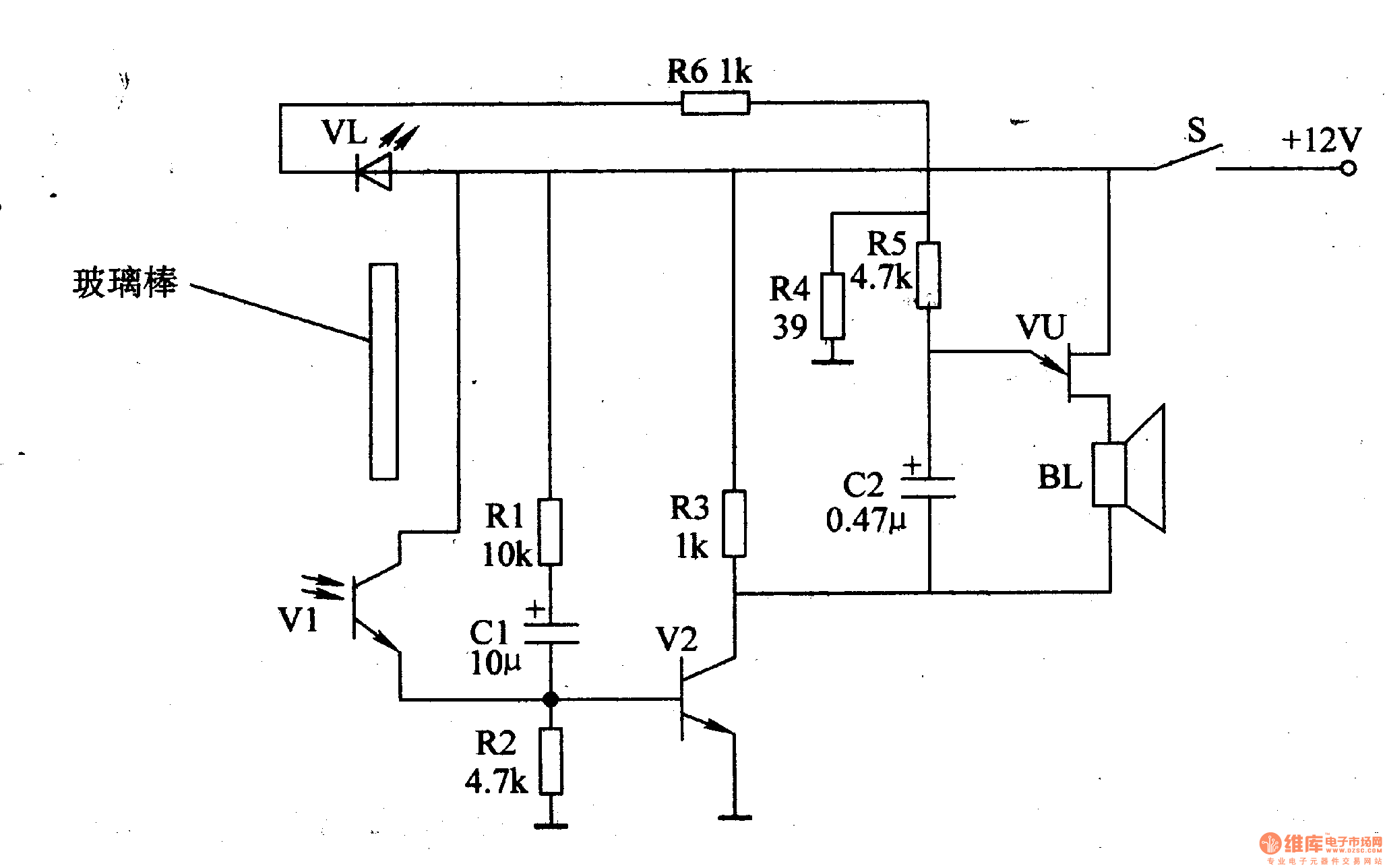 The photoelectric control circuit consists of the LED VL, light sensitive transistor V1, resistors of R1-R3 and R6, capacitor C1 and transistor V2.The sound alarm circuit consists of the resistor(R4, R5), capacitor C2, single knot transistor VU and loudspeaker BL.