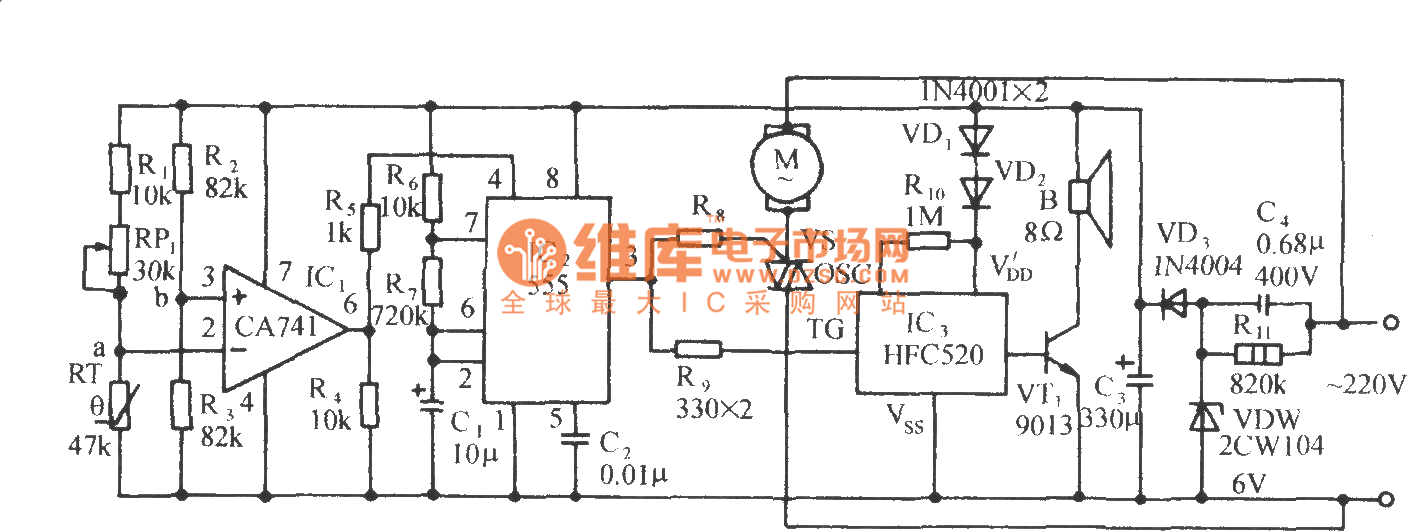 In the hot days, fishponds water temperature also will increase, there is a sharp decline about the oxygen content in water. It is extremely detrimental to the growth of hypoxia on fish, and the added oxygen control circuit will automatically start when the water temperature is higher ( 28 ℃), the water plus oxygen machine is driven by the motor for agitation. The control circuit is composed of thermostat voltage comparing circuit, multivibrator circuit, thyristor motor control circuit, audio sounding circuit and AC buck rectifier circuit and other components, and it is shown in figure.