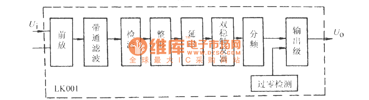 The circuit is shown as the figure. It includes acoustic sensor BM, voice control integrated circuit, SCR control circuit, imitation sound circuit and AC buck rectifier circuit and so on . Voice control ASIC LK001 is the core component of the control circuit, its internal circuit functional block diagram is shown in the following figure.
