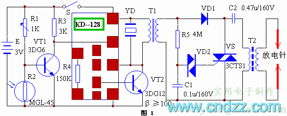 The principle circuit is shown in figure 1. The switch S is linked with the gas switch. When the gas valve is open, S is closed, if the gas is not lit, the LDR R2 is in a high LEV, the triode VT1 is conducting, which triggers the music integrated circuit to play music. At the same time, the transformer T1 is stepping up and outputting a pulse voltage with the peak value of 120Vpp, C1 is charged by R5 and C2 is charged by VD1. When C1 gets a certain voltage, the trigger VD2 is conducting, so is SCR, which makes the charged C2 discharges through T2 primary stage and SCR.