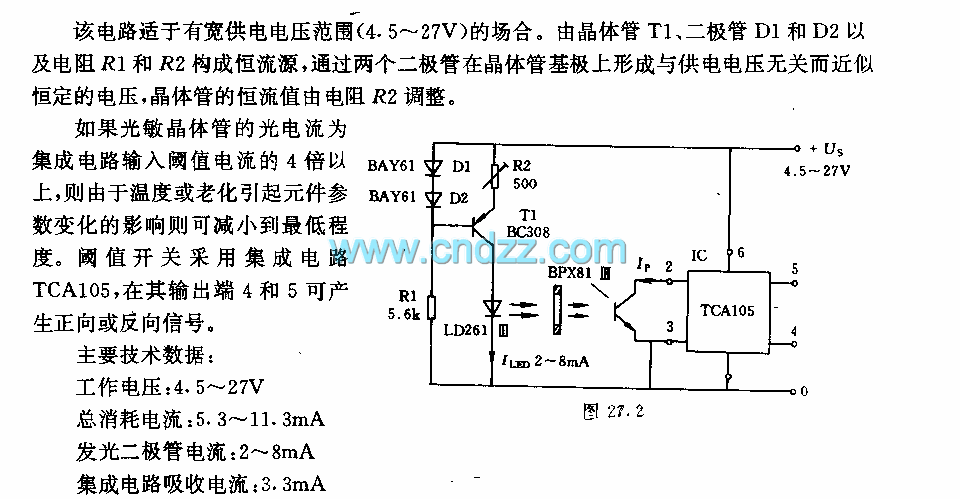 The circuit can be used in situations of wide power supply voltage range 4.5~27V. The constant source of transistor T1, diodeS D1 and D2, resistors R1 and R2 and so on. A voltage which is irrelevant to the power supply but has almost constant voltage is generated on the basic pole of 2 diodes, the constant current is regulated by the resistor R2. If the current of the light sensitive transistor is more than 4 times of the threshold, the effect on the elements caused by the temperature or aging can be minimized.