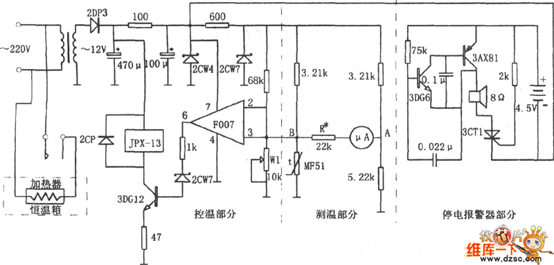 In the figure is the incubation temperature control circuit. This circuit consists of the temperature test circuit, temperature control circuit and power-off alarm circuit, etc.the temperature circuit is a non-equilibrium type bridge, which is indicated with a 50μA meter. One arm of the bridge is a sensitive thermistor MF51 which has backward temperature coefficients. As the temperature in the incubation box changes, the resistance of MF51 is also changing, the LEV between A and B of the corresponding bridge is changing, too. The temperature change is reflected by the pointer of the 50ttA meter.
