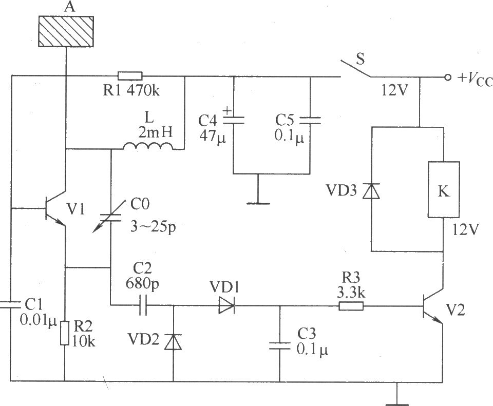 The following is to introduce an inductance controlled switch circuit (capacitance or approach control circuit) made of separated elements, when someone is getting close to the metal current inducting chip, the circuit is on and the load(indicator, alarm or lighting lamp, ventilator and so on) is working. The circuit consists of the inductance pole chip A, RF oscillator, RF detecting circuit and control executing circuit, see as the figure.