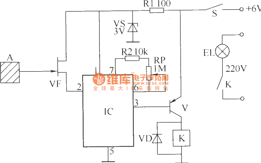 The circuit that will be introduced can be used to control the lighting lamp and auto door, and it can also be used to burglarproof alarm. This circuit consists of the inducting electrode plate A, regulated diode VS, FET transistor VF, music integrated circuit IC, transistor V, relay K, diode VD, resistor R1 and R2, potentiometer RP and power supply switch S, etc, see as the figure.