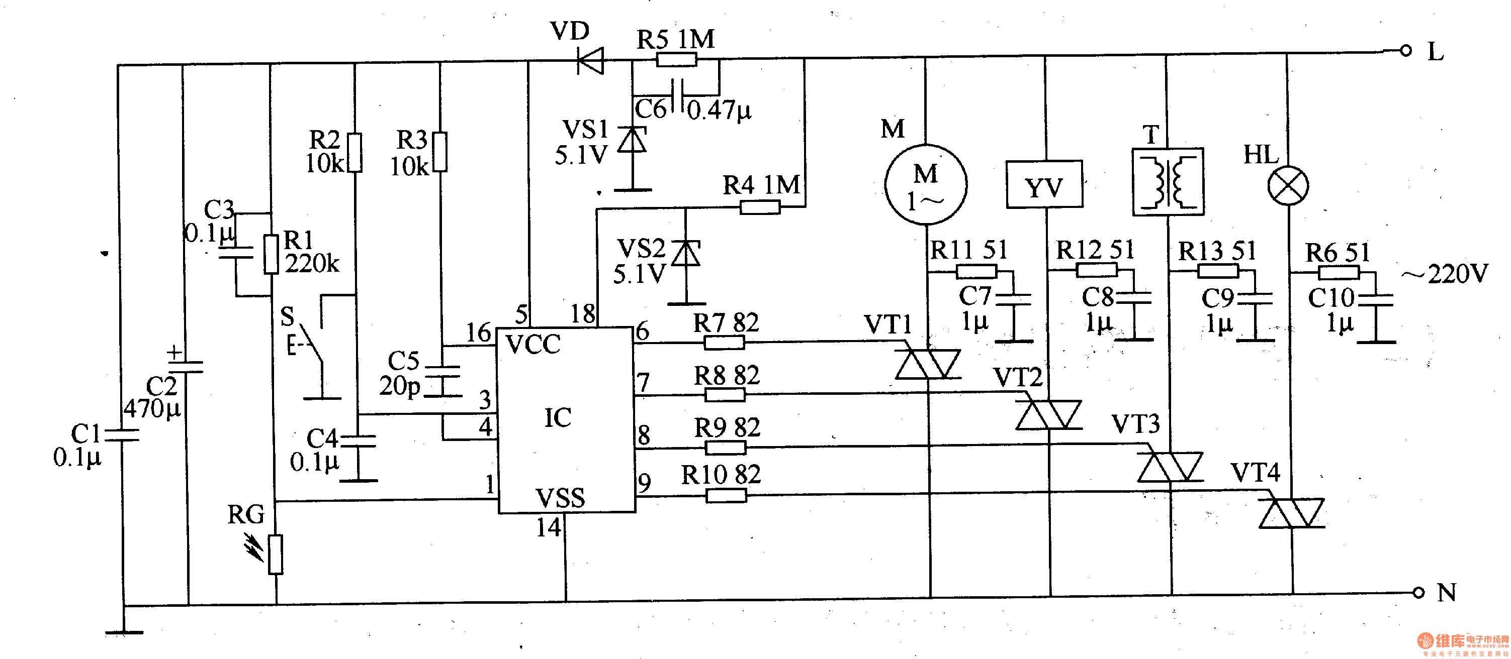 The power supply circuit consists of the capacitor C6, releasing resistor R5, regulated diode VS1, rectifier diode VD and filter capacitors of C1 and C2. The detection/ignition control circuit consists of the resistor R1-R4, light sensitive resistor RG, capacitor C3-C5, reset key S, regulated diode VS2 and control integrated circuit IC.