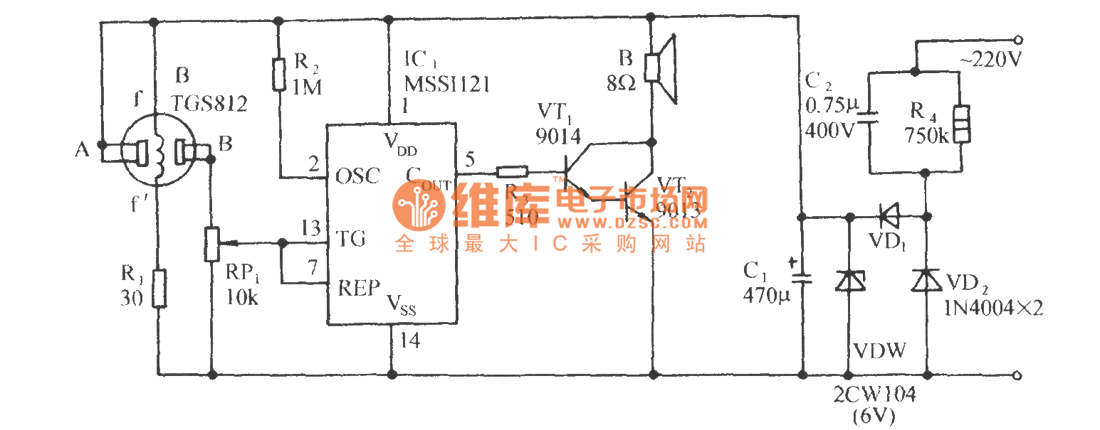 See as the circuit in the figure, it consists of the gas sensor, language generating circuit and AC step-down rectifier circuit, etc.