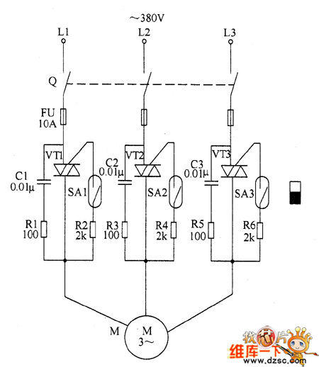The loom electricity saving controller circuit is composed of the knife switch Q, fuse FU, thyristors VT1 ~ VT3, resistors R1 ~ R6, capacitors C1 ~ C3, reeds SA1 ~ SA3 and motor M, and the circuit is shown as the chart. R1 ~ R6 choose 2W metal film resistors. Adjusting the resistance of R2, R4 and R6 can change the VT1 ~ VT3 trigger sensitivity. When the loom stops because of occuring brokenyarn failure, the open and parking handle will jump to the parking position automatically under the action of the clutch. The normally open contacts of SA1 ~ SA3 are disconnected, VT1 ~ VT3 stop running because of the AC zero passage, and the motor M stops operation to enable the power-saving control after automatically stop.
