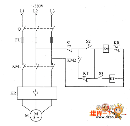 The loom electricity saving controller circuit is composed of the knife switch Q, fuse FU, stop button S1, start button S2, micro switch S3, time relay KT, AC contactor KM, thermal relay KR and motor M,and the circuit is shown as the chart. Turning on the knife switch Q, pressing the start button S2 will make AC contactor KM pull in and the motor M start running. S1 and S2 select compression press buttons; S3 uses the limit switch with the contact current being greater than 1A. KT selects the time relay with the coil voltage being AC 380V. KM selects the AC contact with the coil voltage being 380V, contact current capacity being greater than 15A. Q, FU, and KR should choose with the matching components with M.