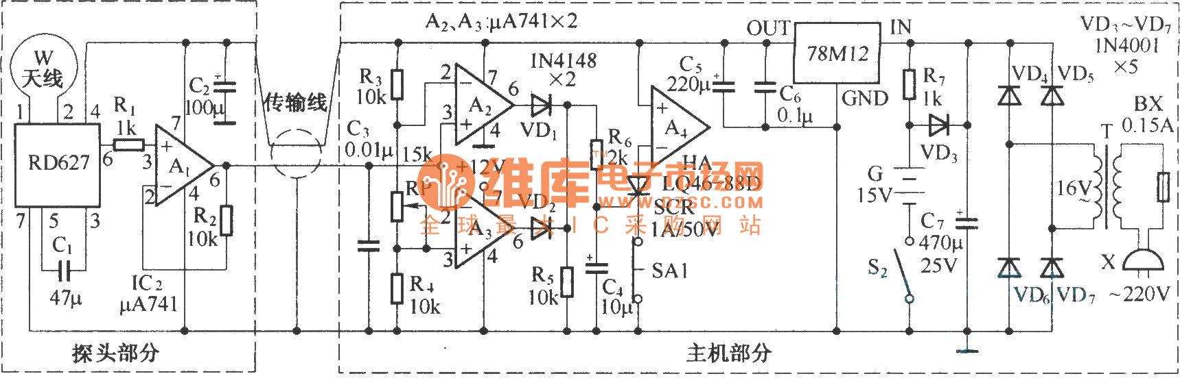 The microwave language burglarproof alarm is fitted in homes, shops, storerooms, orchestras and so on. When someone is going into the alert area, it will make the sound of catch the thief . To prevent it from being broken, there are functions of breakdown alarm and AC/DC power auto shift in it. The principle of the circuit is shown in the figure. The alarm consists of the probe and the host. The probe consists of the microwave sensing module RD627 and op-amp A1, the output signal of RD627 is amplified by A1 and then connected with the host by the dual chip shield cable.