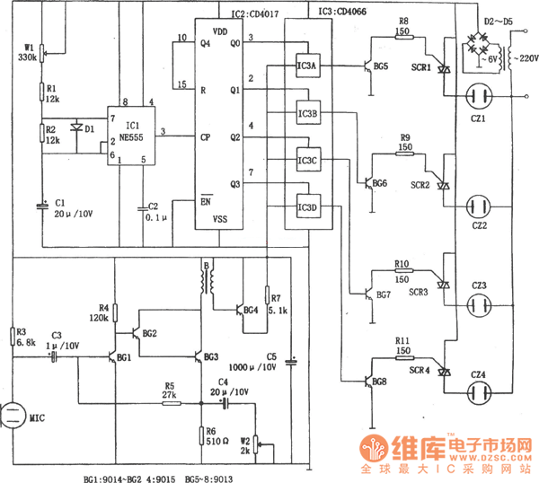 See as the following figure, this is a music fancy lantern controller circuit. The controller consists of sound/power switch and amplifier circuit, clock pulse generator, counting circuit and control circuit, etc. The microphone MIC switch sound signal into power signal, and then the signal is added to 4-channel analog switch CD4066(IC3) after it has been magnified by BG1~BG3. The clock pulse generator consists of IC1(555), W1, R1, R2, D1, C1 and so on, the period of signal generating is T=0.693(Rw1+R1+R2)C1, the period corresponding to the figured parameter ranges 0.5~5s, of which the 3-pin output of 555 is added to IC2 as the CP pulse.