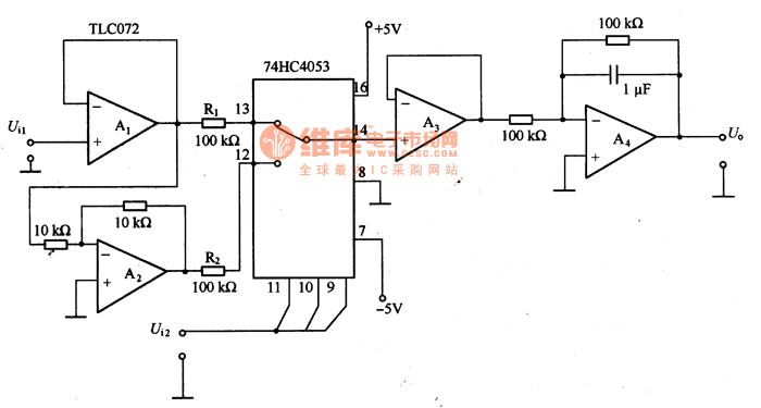 This is the phase wave detection circuit composed of 74HC4053. the circuit consists of the computing amplifier TLC072 and the analog switch 74HC4053, but the conducting resistance of the analog switch changes with the temperature and the power supply voltage. In the circuit, the output of the analog switch 74HC4053 is connected with the voltage follower composed of A3, so the conducting resistance doesn’t affect the output. If the impedance of the input signal is very low, then A1 is needless. Although the 74HC analog switch can’t be assure of “breading first, connecting second”, if 74HC4053 makes both A1 and A2 short, it won’t problematic.