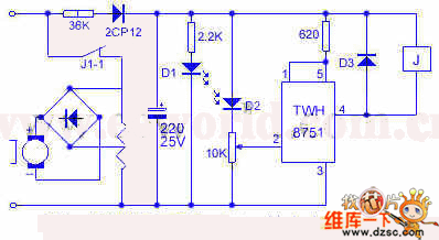 45. The self-made fast hand drier circuitThe drier will blow out warm air if the washed hand is below it, and when the hand becomes dry, it will stop automatically, see as figure 2. When there is light, the 1-pin of the IC is in a low LEV, TWH8751 is blocked, J is power-off, J1-1 is broken down. When the hand is blocking the light, D2 is in a high resistance, the 2-pin of IC is in a low LEV, so the output terminal of IC is conducting, J1-1 is passable, the heating wire and motor get power, so the warm air is blown out. The power supply of the control wire is stepped down and rectified by the 36K resistor and 2CP12, then the voltage of 18V or so is acquired.