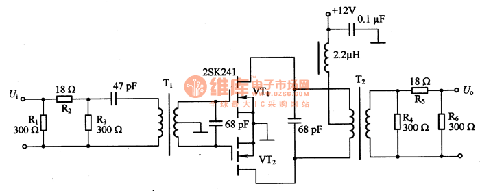 This is the tune circuit composed of MOSFET and inductance coils, which can only amplify the signals of certain frequency, it is fitted in the terminal circuit of low power emitters. The circuit is in push-pull pattern, so there few odd harmonic waves, its gain without connecting with attenuator is +20~+30dB at the frequency of 14MHZ. in the circuit, R1, R2 and R3 composed the input attenuator, R4, R5 and R6 form the output attenuator; VT1 and VT2 are the 2SK241 power MOSFET. If larger gain and output power are needed, one more parallel 2SK241 can meet the need. When the gain is two large and the impedance may be mismatching, an attenuator can be fixed in it.
