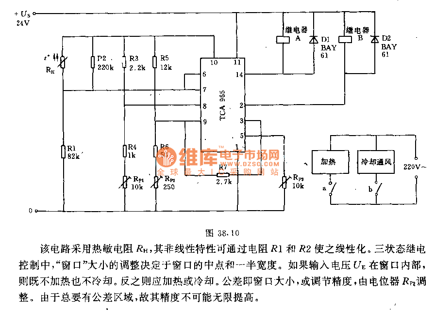 This circuit uses the thermistor RH, it's nonlinear characteristics can be changed into the linear characteristics by R1 and R2. In the three states of the relay control, the window size adjustment depends on the halfway point of the window and the half width. If the input voltage UE is in the window, the circuit is neither heating nor cooling. Otherwise, it should be heating or cooling. The tolerance is the window size or the mediate precision, it is adjusted by the potentiometer RP2. Because there must be the tolerance zone, so the precision may not infinitely improved.