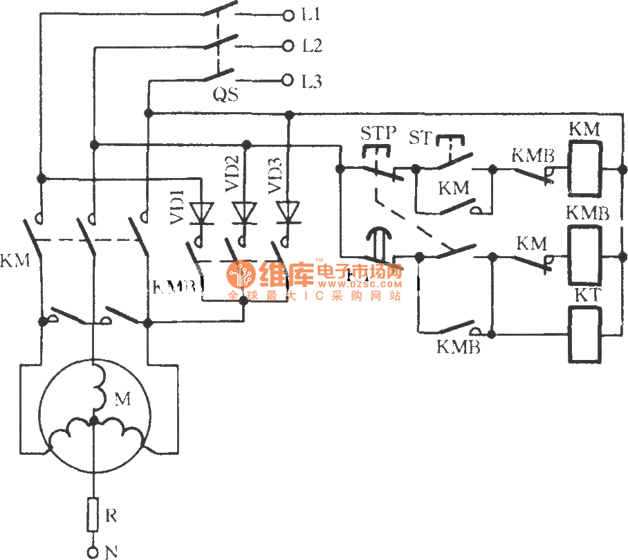 As the figure shows, when you press the STP, the AC contactor KM will loss the electrical energy and release, the KMB and KT get the electrical energy to act immediately, the two groups of main contactor of KMB will make the three-phase winding wire of the electromotor M get into the short circuit state, the other three groups of main contactor introduce the three-phase half wave rectifying power supply to make the stator winding of the electromotor M connect into the symmetrical parallel line, so we achieve the purpose of braking. Then the KT cuts off, the KMB losses the electrical energy to release, the braking is over. R is the limiting resistor.