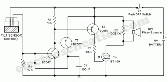 Preset pot P1 is deliberately added here to adjust the circuit sensitivity. This may become necessary if you are trying a different (readymade) tilt sensor. Similarly,SCR(T4) and piezosounder (BZ1) may be replaced with near equivalent parts. Resistor R3 (100-150 Ohm) is optional.
