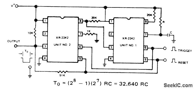 Cascaded operation of Exar XR-2242 long-range timers provides ultralong time delays, up to 1 year, Cascading of counter sections provides 32,640 clock cycles before output pin 3 of unit 2 changes state. Common pull-up resistor makes counter section of unit 2 trigger each time output of unit 1 makes positive-going transition. Cascading additional timer with unit 2 extends time delay to 1.065 x 109RC. With RC values giving 0.1 s, time delay becomes 3.4 years.- Timer Data Book, Exar Integrated Systems, Sunnyvale, CA, 1978, p 19-22.