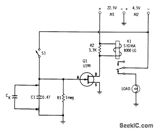 With values shown, circuit gives delay of several seconds. Increas-ing C1 bv shunting with 20-μF capacitor delays energizing of relay to over 1 min. C1 is charged to -4.5 V when switch S1 is closed, biasing gate to cutoff and deenergizing relay. When S1 is open, capacitor begins discharging at rate determined by RC time constant of circuit. When voltage across capacitordrops to point at which 01 conducts, relay is energized and power is applied to load.-E. M. Noll, FET Principles, Experiments, and Projects, Howard W. Sams, Indianapolis, IN, 2nd Ed., 1975, p 215-216.