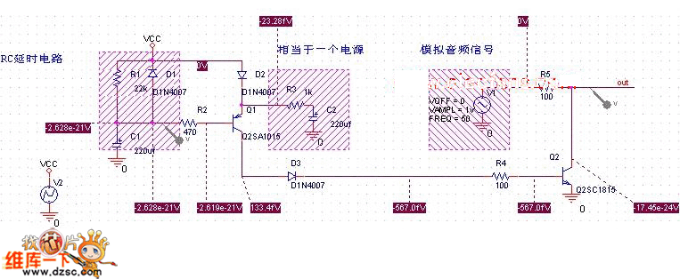 The leftmost is RC time delay circuit and discharging diode. The middle is the circuit set for shutdown and you can regard it as a power supply. The rightmost circuit is used for simulate audio signals.
