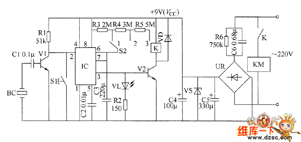The timing controller circuit is composed of the power supply circuit, input control circuit, timing circuit and output control circuit, and it is shown as the chart. The power supply circuit is composed of the step-down capacitor C6, discharge resistor R6, bridge rectifier UR, filtering capacitors C5, C4 and the voltage regulator diode VS. The input control circuit is composed of the piezoelectric ceramic BC on electronic alarm clock, capacitor C1, resistors RI, transistor VI. Timing circuit consists of resistors R1 ~ R5, reset button S1, regular timing switch S2, capacitors C2 and C3, light-emitting diode VL, time-based integrated circuit IC.