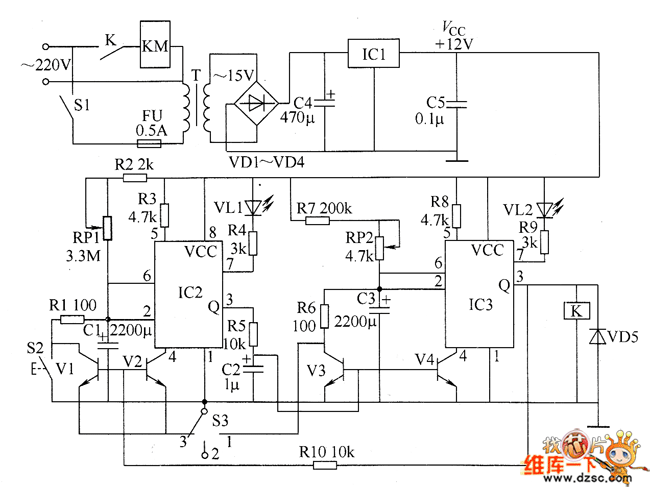 The timing controller circuit is composed of the power supply circuit, timing control circuit and control implementation circuit, and it is shown as the chart. Power supply circuit is composed of the power switch S1, fuse FU, power transformer T, rectifier diodes VD1 ~ VD4, filter capacitors C4, C5, and three-terminal voltage regulator integrated circuit IC1. Timing controller circuit is composed of the time-base circuits IC2, IC3, resistors R1 ~ R1O, capacitors C1 ~ C3, potentiometers RP1, RP2, transistors V1 ~ V4, light-emitting diodes VL1, VL2, manual discharge button S2 and function selector switch S3.