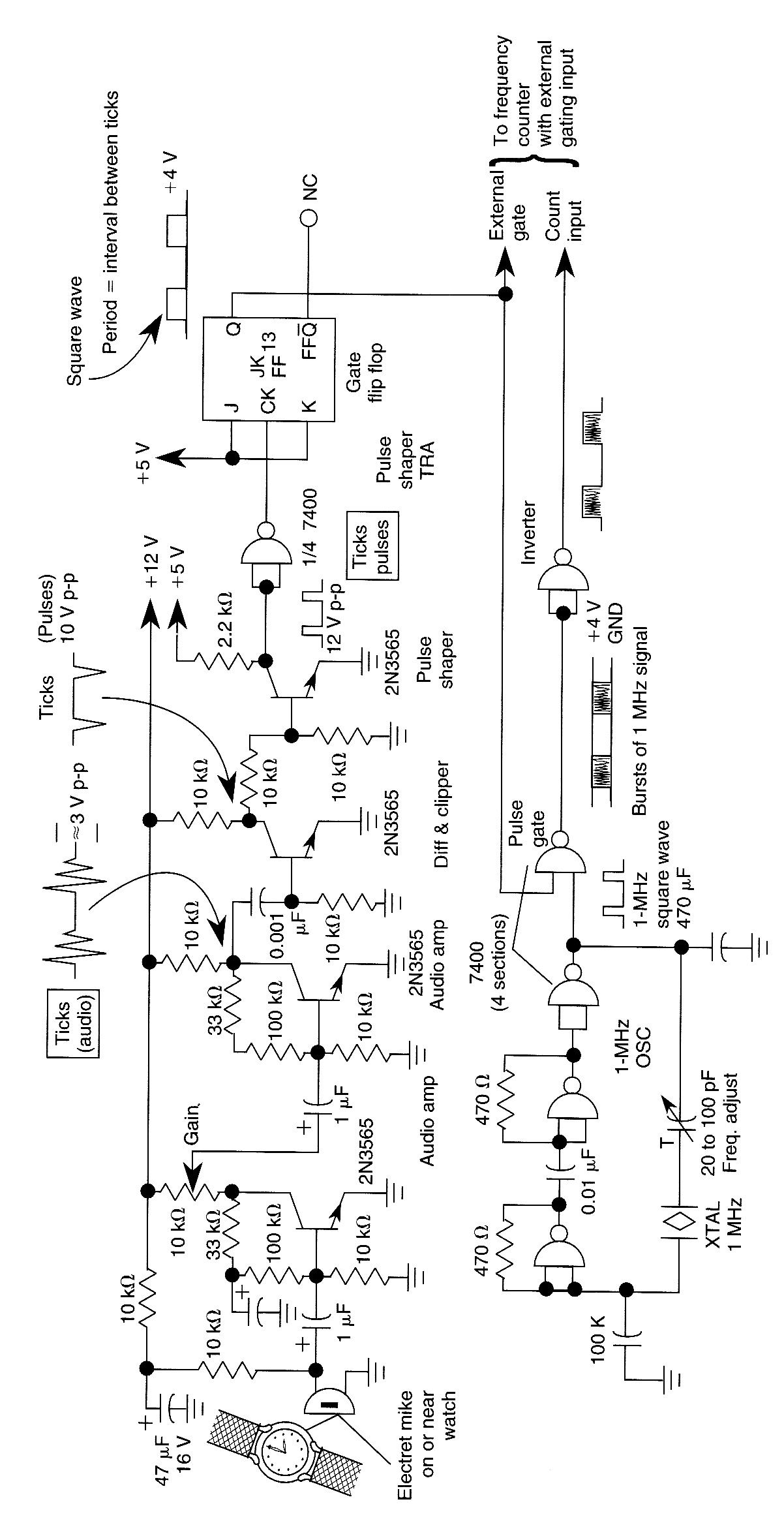 This circuit adapts a frequency counter to measure intervals. It was originally used as a shutter speed checker for a photo ap-plication. The watch ticks are clipped and shaped and formed into a square wave. This square wave is used to gate an accurately known clock (1-MHz TTL XTAL OSC) and an external counter is used to directly count the clock pulses during the interval to be measured. A 1-MHz clock can be used to measure to a resolution of 1 psec. Accuracy = ± time base ±1 μs ±t1 count LSB.