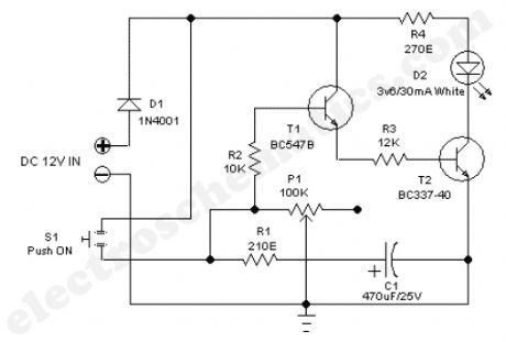 Tiny Timer Light Switch presented here is a simple transistorised electronic timer which drives a high efficiency white LED for a finite time out. This circuit is very useful for in-car reading etc. The circuit works off 12 volt dc supply. After construction, fit the unit at a suitable location inside your car and power the circuit from the in-dash standard cigar lighter socket. The timer light switch is ultra simple, economic, straight forward and self explanatory. How the timer light switch works?Normally T1 is turned off by P1 and R2. When the trigger switch S1 is pressed the base of T1 is connected to the +12V supply via R2. Now T1 turns on and this action turns on the next transistor T2 which in turn energises the white LED (D2). Resistor R4 limits the operating current of white LED (D2).