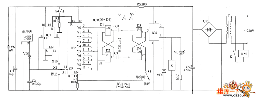 The timing controller circuit is composed of the power supply circuit, clock signal generator, counting distributor circuit, trigger circuit and control output circuit, and the circuit is shown as the chart. Power supply circuit is composed of the power transformer T, bridge rectifier UR, filter capacitors C1, C5, current limiting resistor R5 and Zener diode VS. The clock signal generator is composed of the electronic watch, diode VD1, capacitor C2 and count divider integrated circuit IC1. Counting distributor circuit consists of the counting distributor integrated circuit IC2, resistors R1, R2, timer selector switches S1, S2 and reset button.