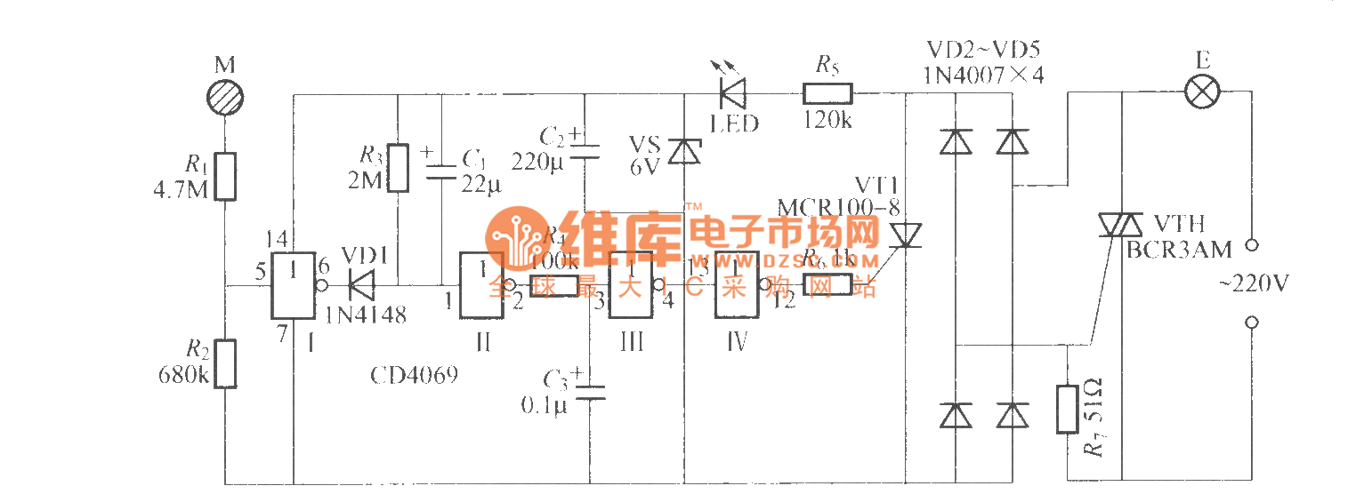 The figure is as shown, it is a touch delay light with CD4069 digital integrated circuit, it adopts two-wire system connection, it can instead of ordinary light switch directly, it is not needed to change the indoor original wiring. The circuit delay time is determined by the discharge time of R3, C1, the data is about 1min.