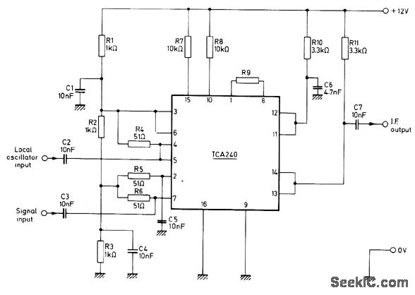 Wideband mixer for high-frequency SSB circuits operates from single 12-V supply. Gain is controlled by R9 and increases as value of R9 is decreased. Output at pins 13 and 14 is product of local oscillator and signal input frequencies and contains desired IF value for receiver. Oscillator signal level should be kept below 20 mV to avoid undesired harmonics produced by limiting. Circuit uses Mullard TCA240 dual balanced modulator-demodulator.- Applications of the TCA240, Mullard, London, 1975, Technical Note 18, TP1489.