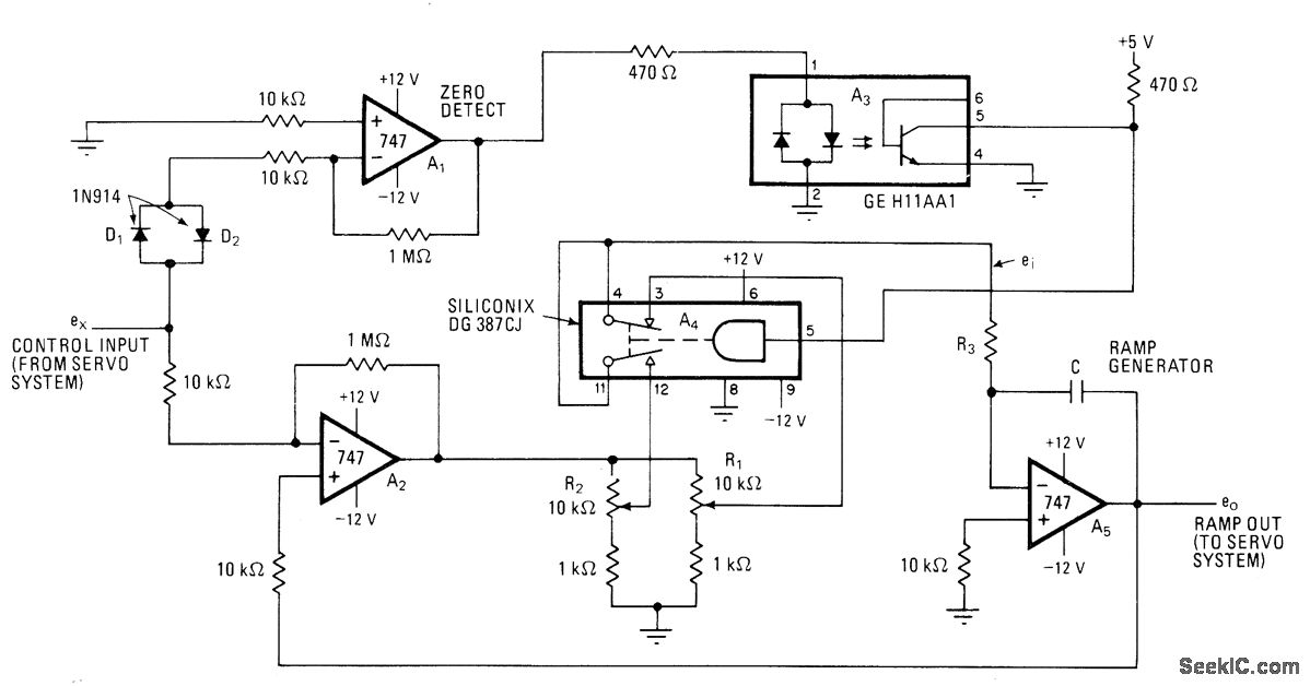 Siliconix DG387CJ solid-state relay A4 provides switch-ing from up ramp to down ramp for decelerating servo when it zeroes in on correct new position. Slopes are determined by settings of R1 and R2. Arrangement ensures optimum senro system response at low cost. A1 detects that input is other than 0 V and energizes optoisolator A3 for switching A4. Resulting positive-going ramp from A5 moves system load toward desired position, making feedback voltage of servo reduce control-input voltage. When this drops to within 0.7 V of ground, A1 goes low and A3 turns off. A4 now initiates down-ramp waveform to decelerate system to stop. For ramp rate of 20V/s, C can be 0.33μF and R3 1.8 megohms.-R.E. Kelly, Up-Down Ramp Quickens Servo System Response, Electronics, July 20, 1978, p 121 and 123.