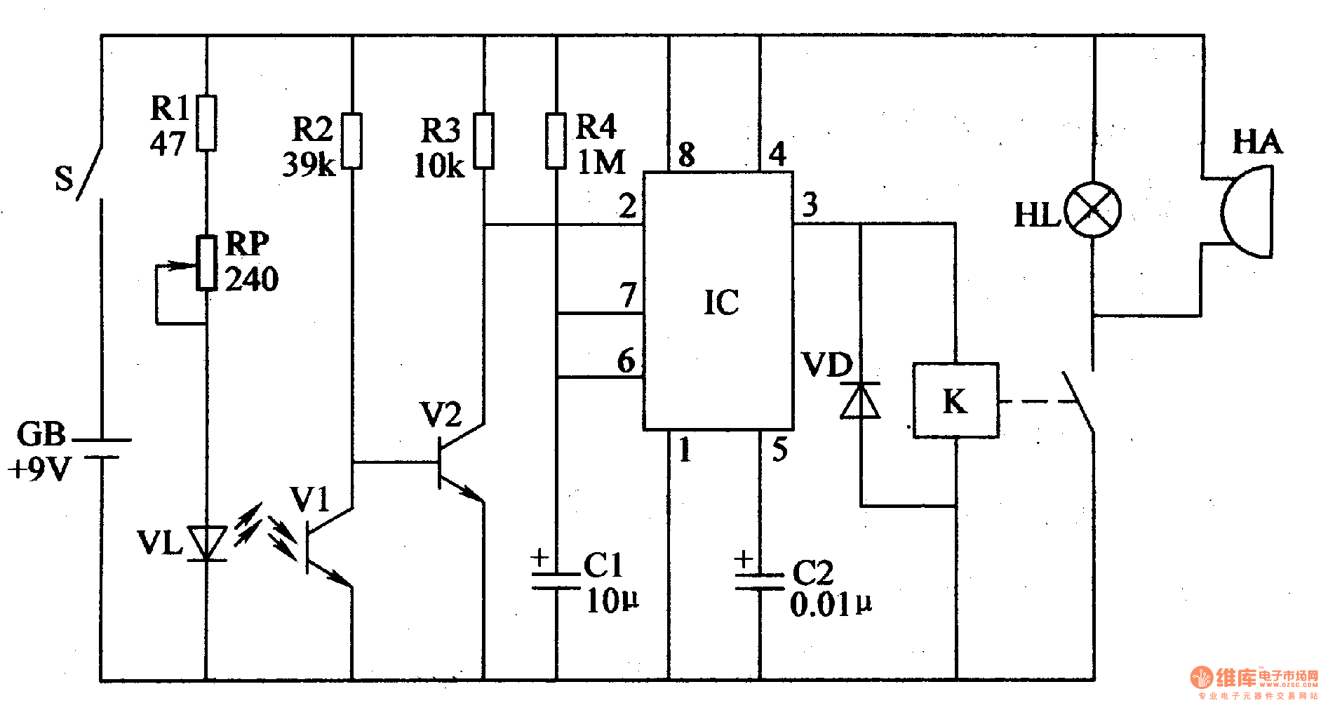 The principle of circuitThe united reaper full warehouse reminder circuit is formed by the photoelectric detection amplification circuit,monostability circuit and the sound and light alarm circuit,which is shown in Figure 4-98. The photoelectric detection amplification circuit is formed by the infrared light-emitting one-diode VL,resistors R1-R3, potentiometer RP, infrared phototransistor V1 and transistor V2. The monostability circuit is formed by the time-base integrated circuit IC,resistor R4 and capacitors C1, C2. The sound and light alarm circuit is formed by the relay K, one-diode VD, indicator light HL and buzzer HA.