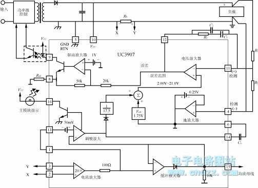 From the structure of UC3907, itcan be divided into voltage loop and current loop two parts. Voltage loop is composed by voltage amplifier,and the driver amplifier; Current loop is composed by current amplifier, adjust amplifiers, buffer amplifier and state instructions constitutes. UC3907's pin 14 outputs between 1.5 V and 2.25 V, pin 6, 7 constitute a loop with resistance R1, R2, emitter is about 150 V.