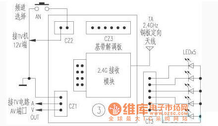 This is 2.4 GHz baseband demodulation plate. Plate directional antenna receives 2.4 GHz signal and sends it to 2.4 GHz receiving module toisolateaudio and video signals, then the baseband clutter signal is filtered out by subsequent circuit, then it ismagnified into standard AV signal output, then it is input to TV. The 2.4 GHz transceiver module, 2.4 GHz transceiver antenna, 2.4 GHz baseband demodulation board and black and white veneer camera in thesystem are all from shenzhenYoujin electronic Co., LTD.