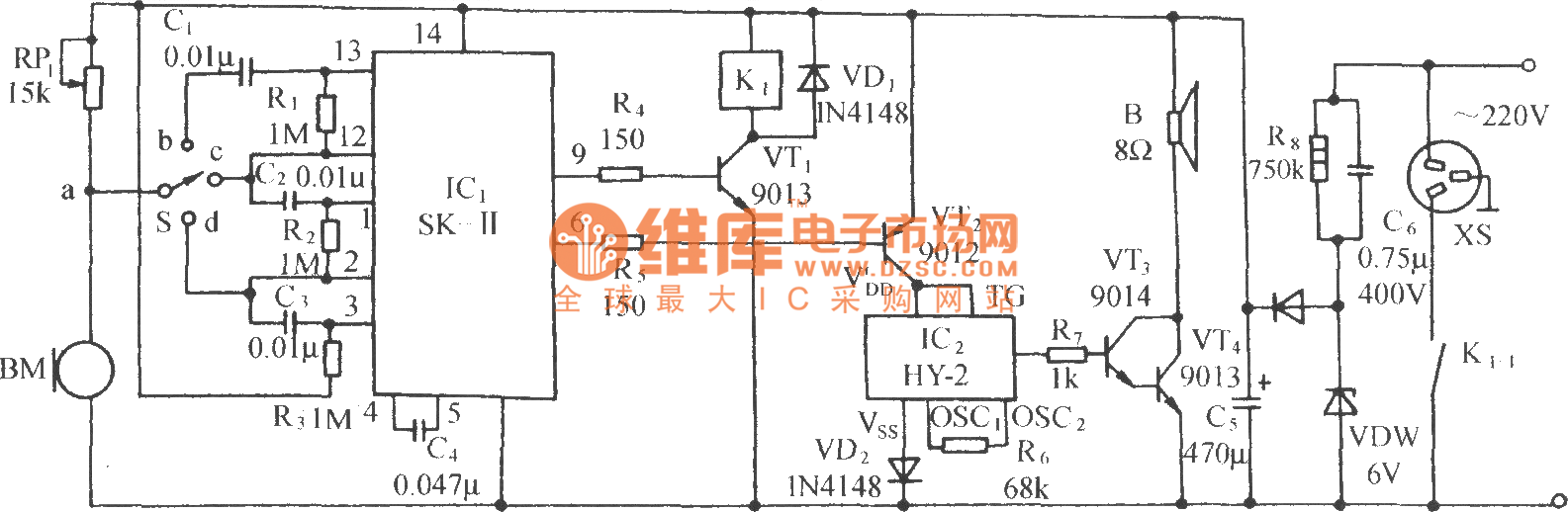 Asshown in the figure,the circuitincludes acoustic sensor , SK - II sound control circuit, relay control circuit, music sound circuit and AC buck rectifier circuit. BM is the acoustical / electrical transducer.